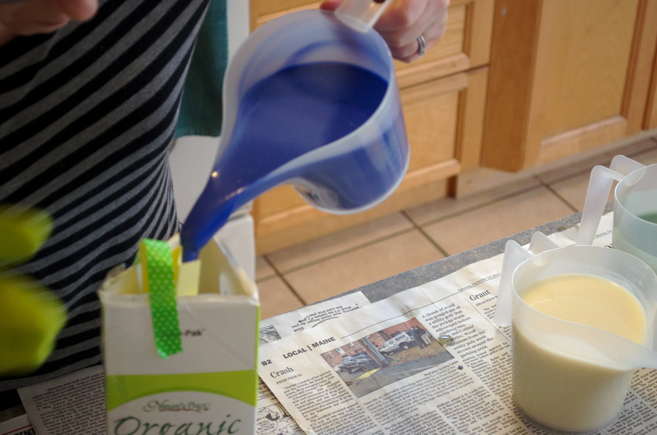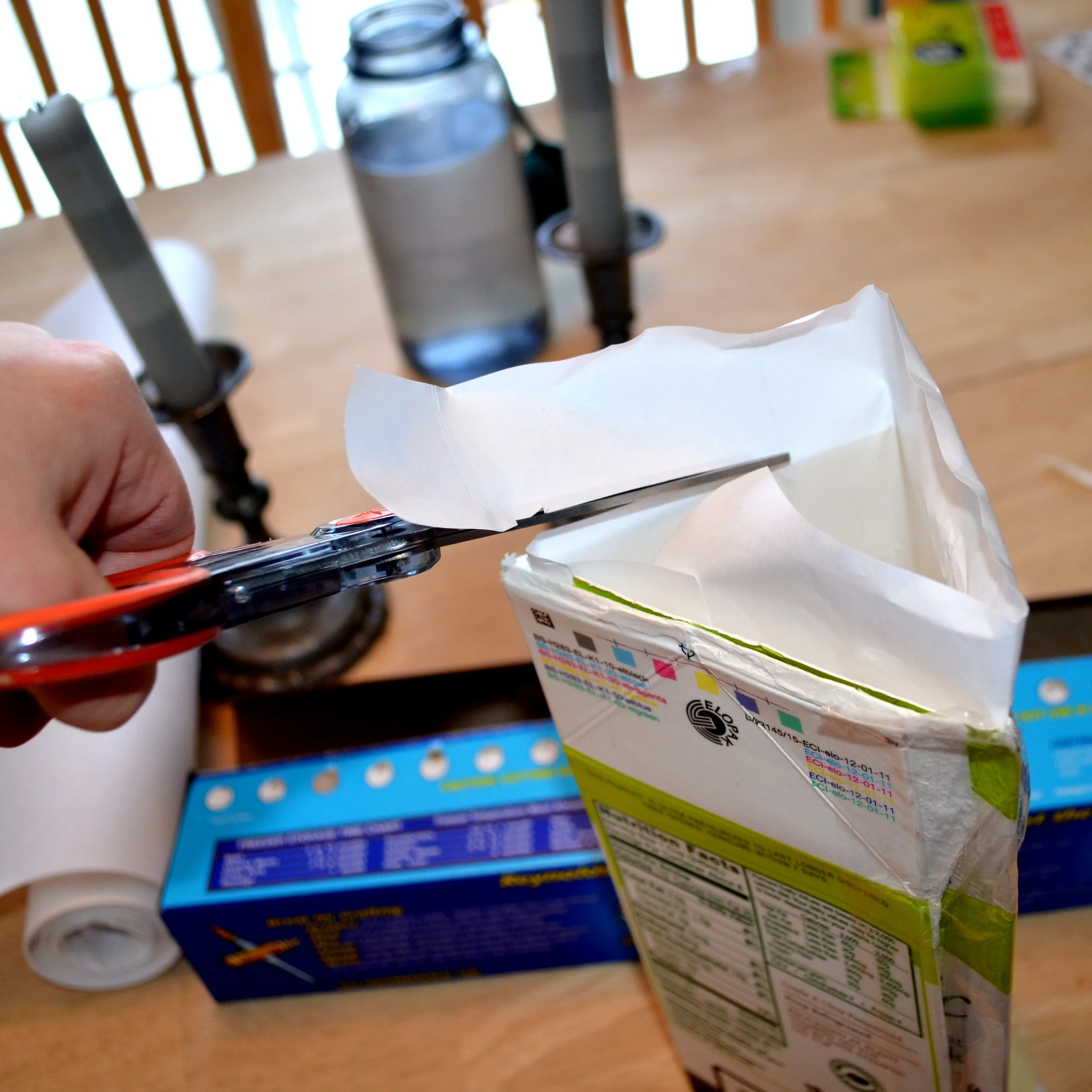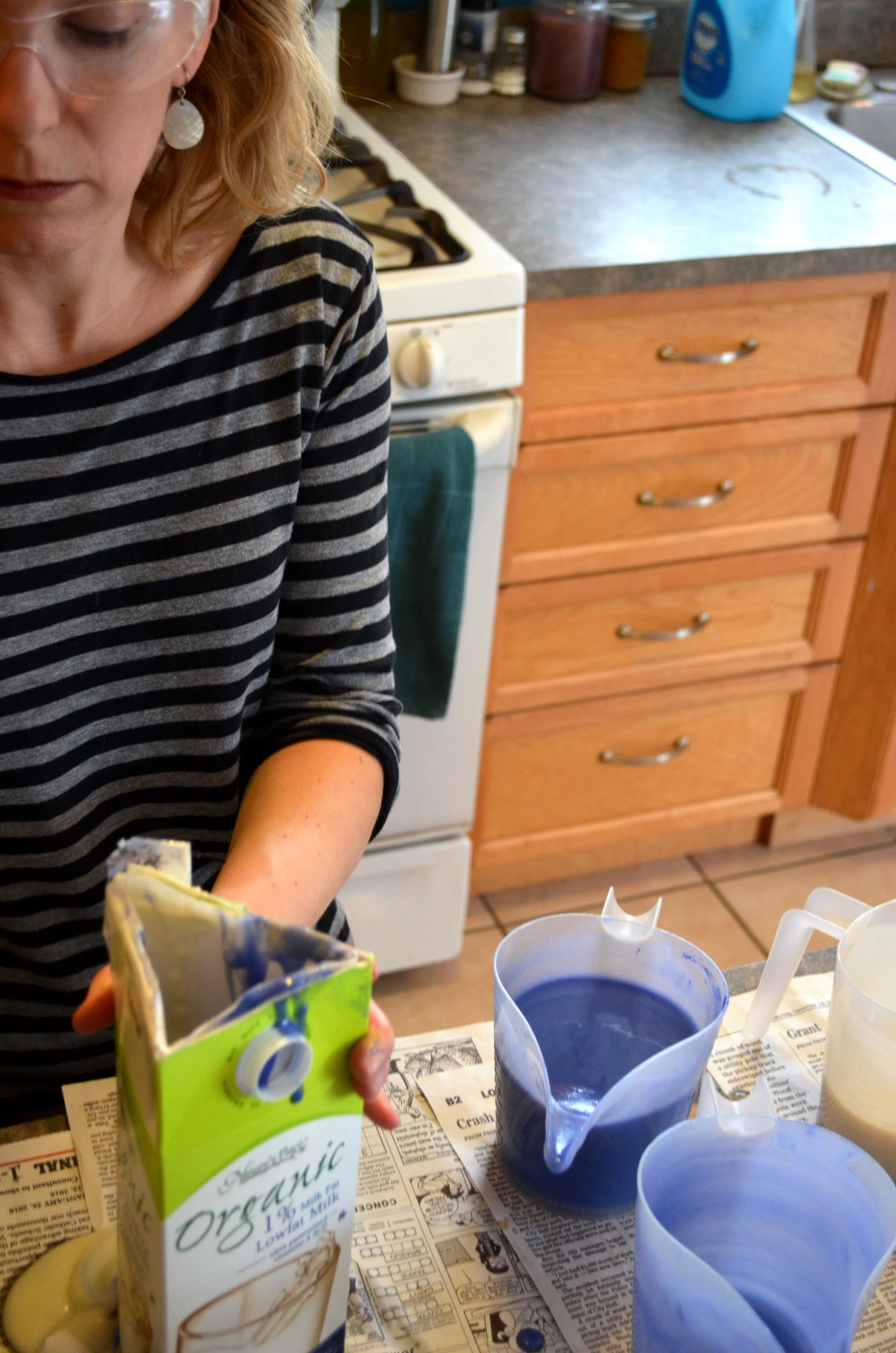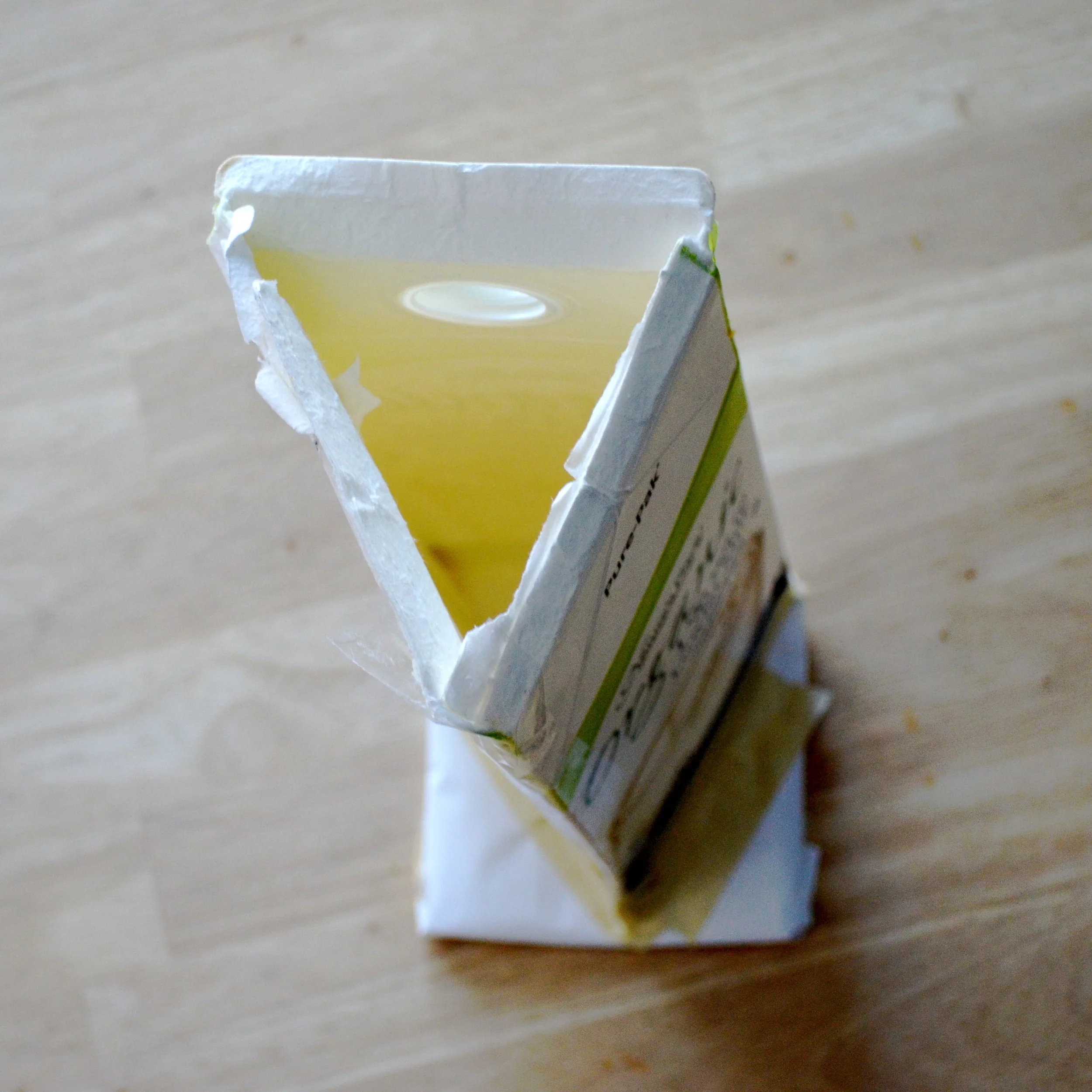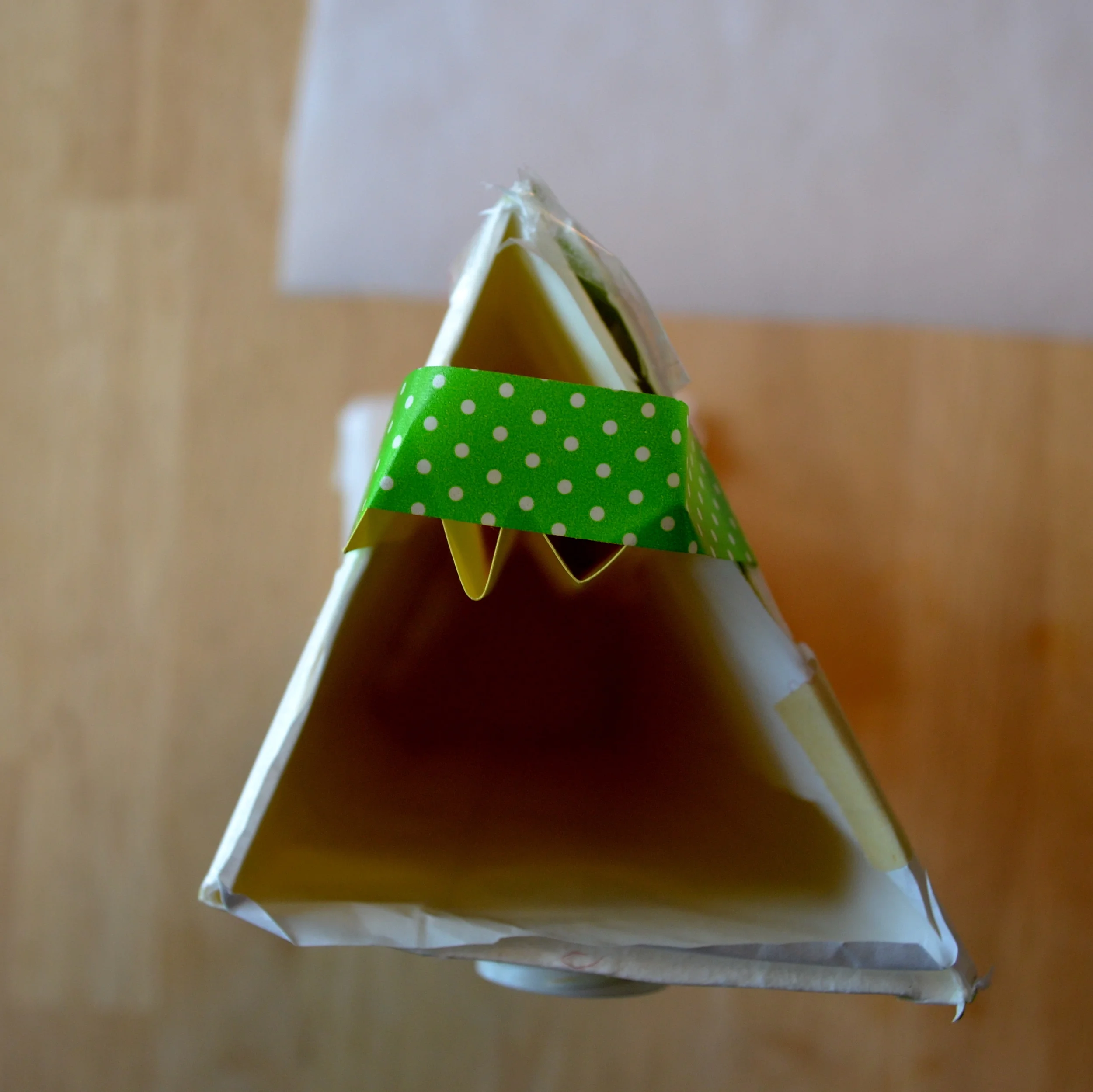 Behold: the milk carton is transformed into a triangle mold, with the help of its trusty friend, Packaging Tape.