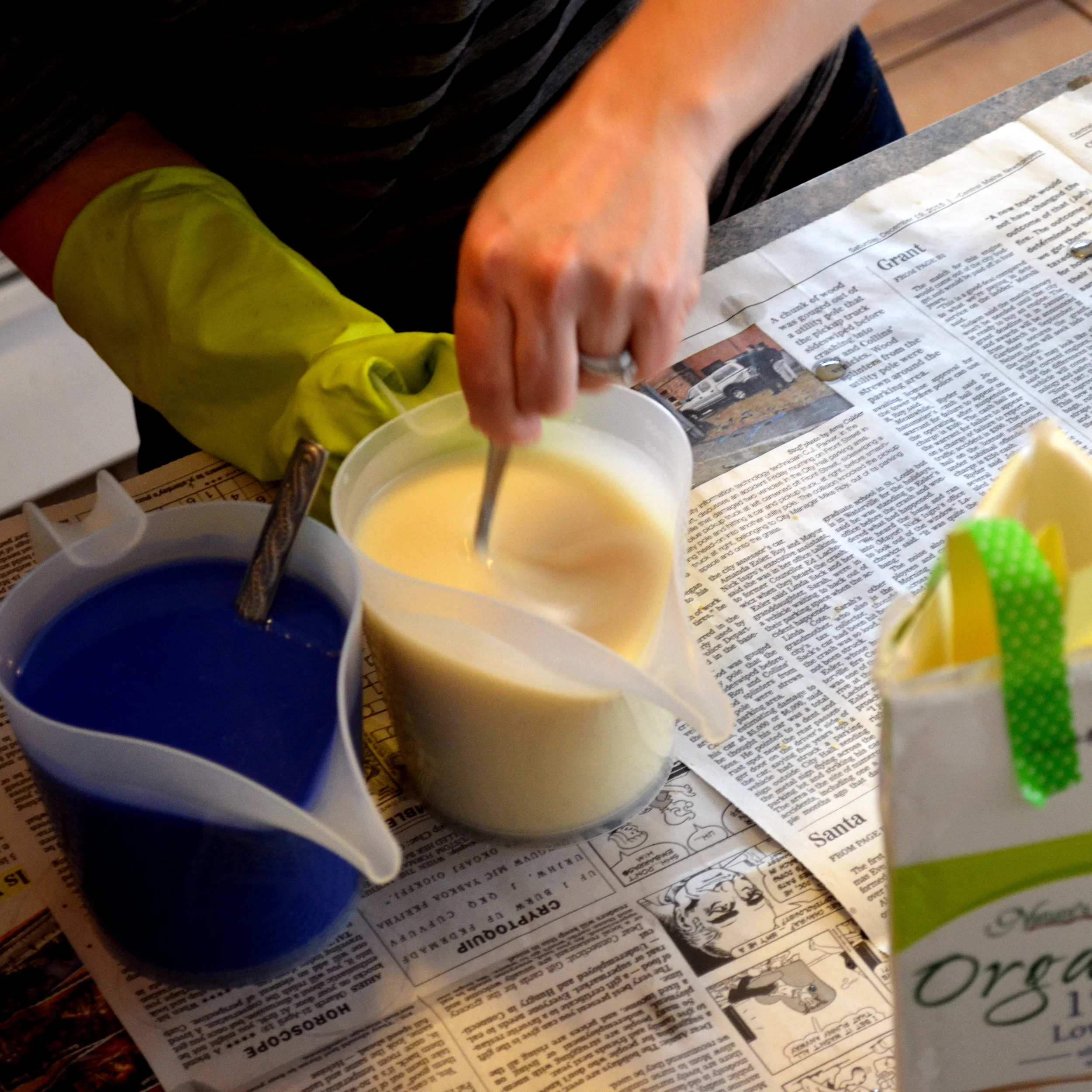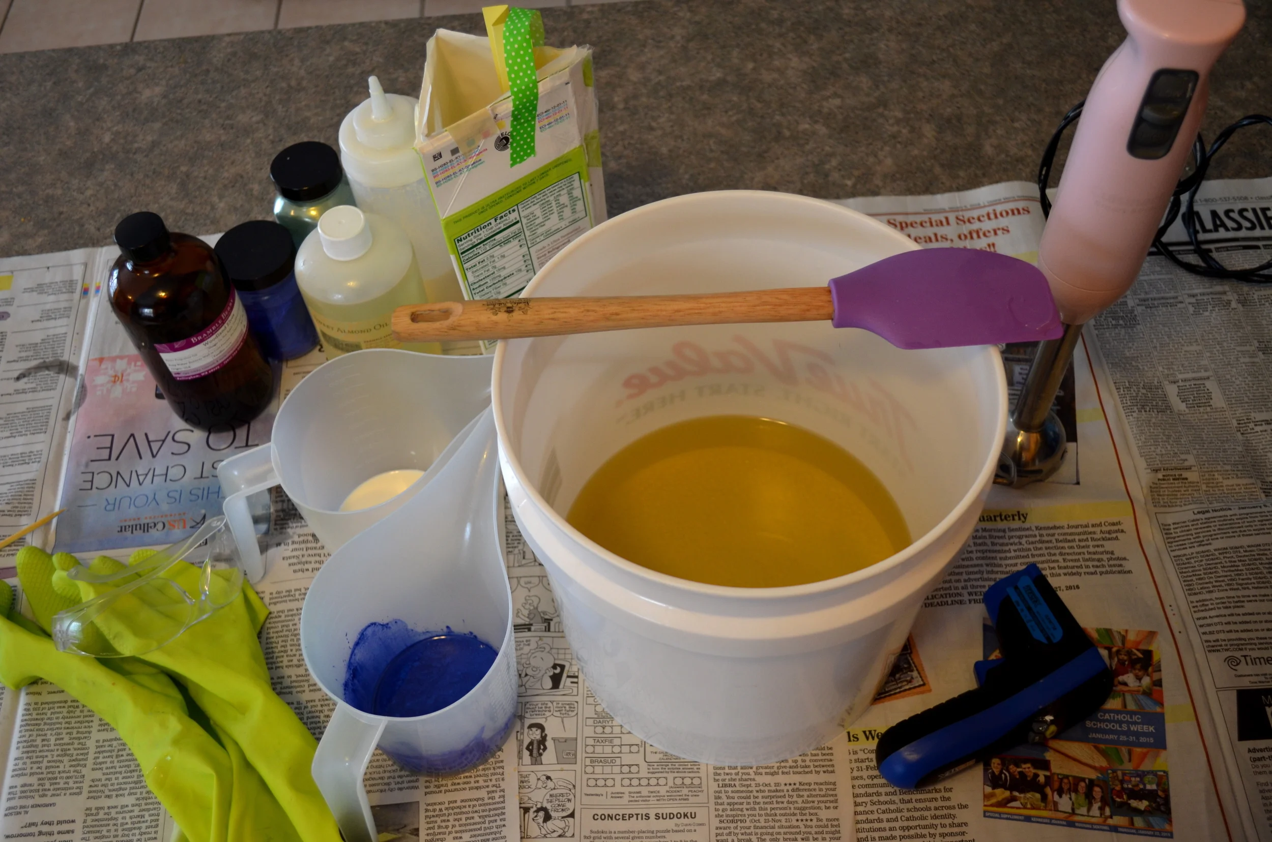 Aaaaahhhhh...the oils are all melted and ready, the mold is set up, the colors are premixed and waiting, and all I need is the lye water to get this party started.